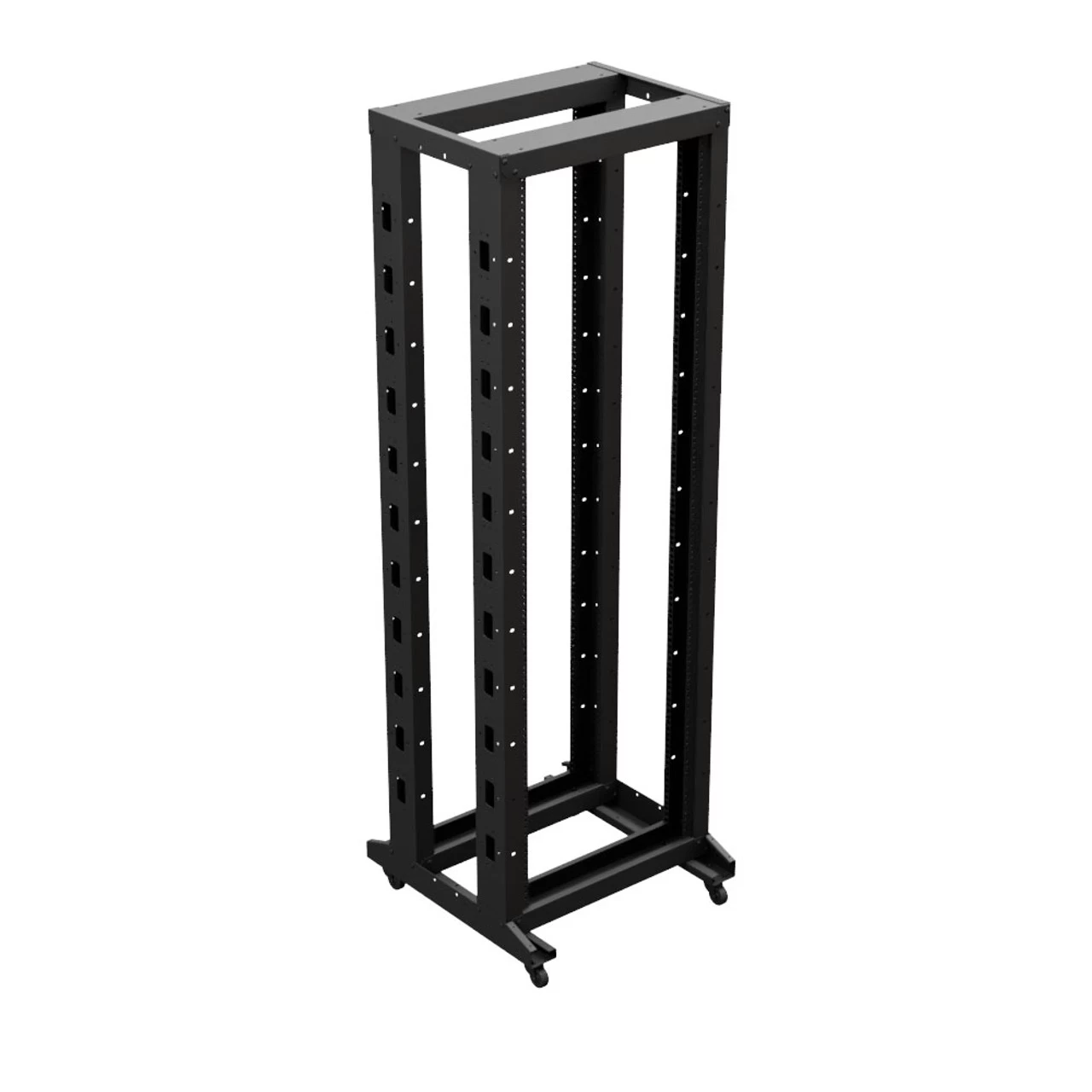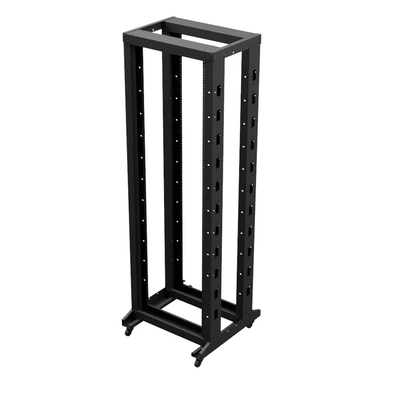 The caster-included adjustable server rack enables you to preconfigure racks and then move them into the desired place, two of these casters have a lock that helps to immobilize the equipment. Constructed of heavy-duty 14 gauge cold-rolled steel with a black, powder-coated finish, this rack delivers excellent utility and durability for your installation. This network rack has overall dimensions of 23.62 in x 23.62 in x 70.29 in and has an adjustable depth, which provides flexibility to handle full-size servers or conserve floor space. The 12-24 threaded RU mounting rails are silk screened with the appropriate markings.