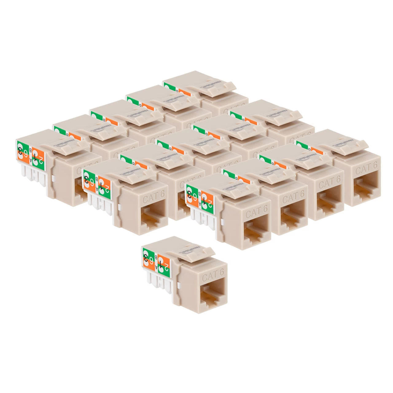 The Ethernet RJ45 keystone jack is of standard size and recommended for use with solid conductor 23AWG or 24AWG wire as found in standard installations. CAT6 RJ45 Keystone modular jacks work with patch panels, rack panels, wall plates, surface mount boxes, or any mounting device compatible with standard keystone sizes. The Snap-In keystone jack is sold in a pack of 15.