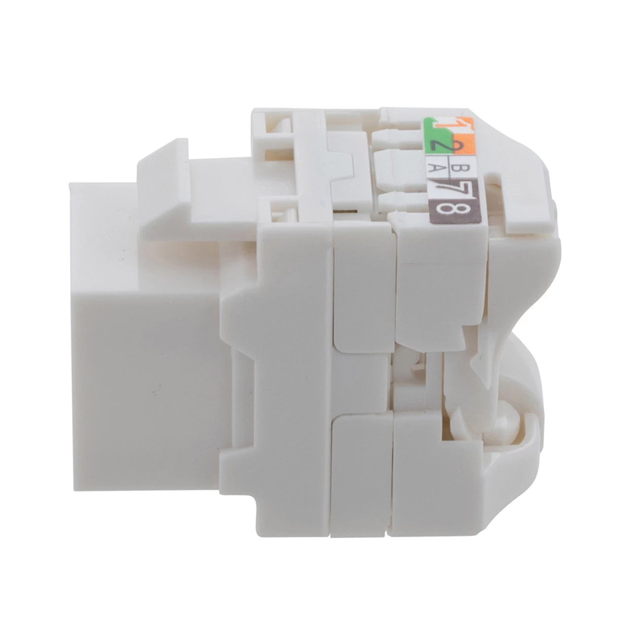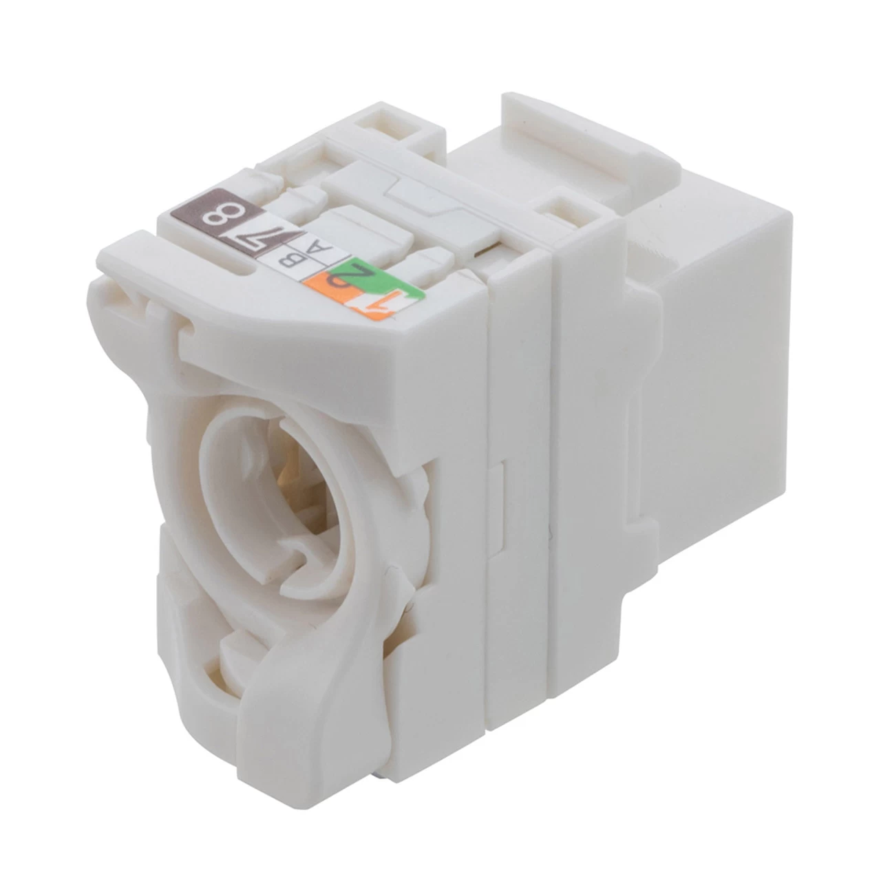The NavePoint 00407193 RJ45 female keystone jack connects a finished cable via an RJ45 to unterminated Ethernet bulk cable via a punch-down. This white toolless keystone jack is designed for use with NavePoint patch panels, wall plates, and surface mount boxes that have standard keystone ports. This jack has a CAT6A speed rating and comes in a packaging quantity of 10.