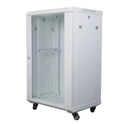 This signal white color 22U network cabinet can be mounted on a wall or used as a freestanding unit and has an overall max weight capacity of 130 lbs. The powder-coated enclosure has removable side panels, and the reversible, reinforced tempered glass front door offer access for easy servicing and cabling access.This 00407321 from NavePoint network cabinet provides rail mounting with square hole/cage nuts, and the mounting rails have appropriate RU markings. Ships flat packed and requires some assembly. Includes: M6 screws and cage nuts (x24), door keys (x2), anchors (x4), casters (x4). Unit dimesions (HxWxD) 43″x23.6″x23.6″. Max Rail Depth 21.5″