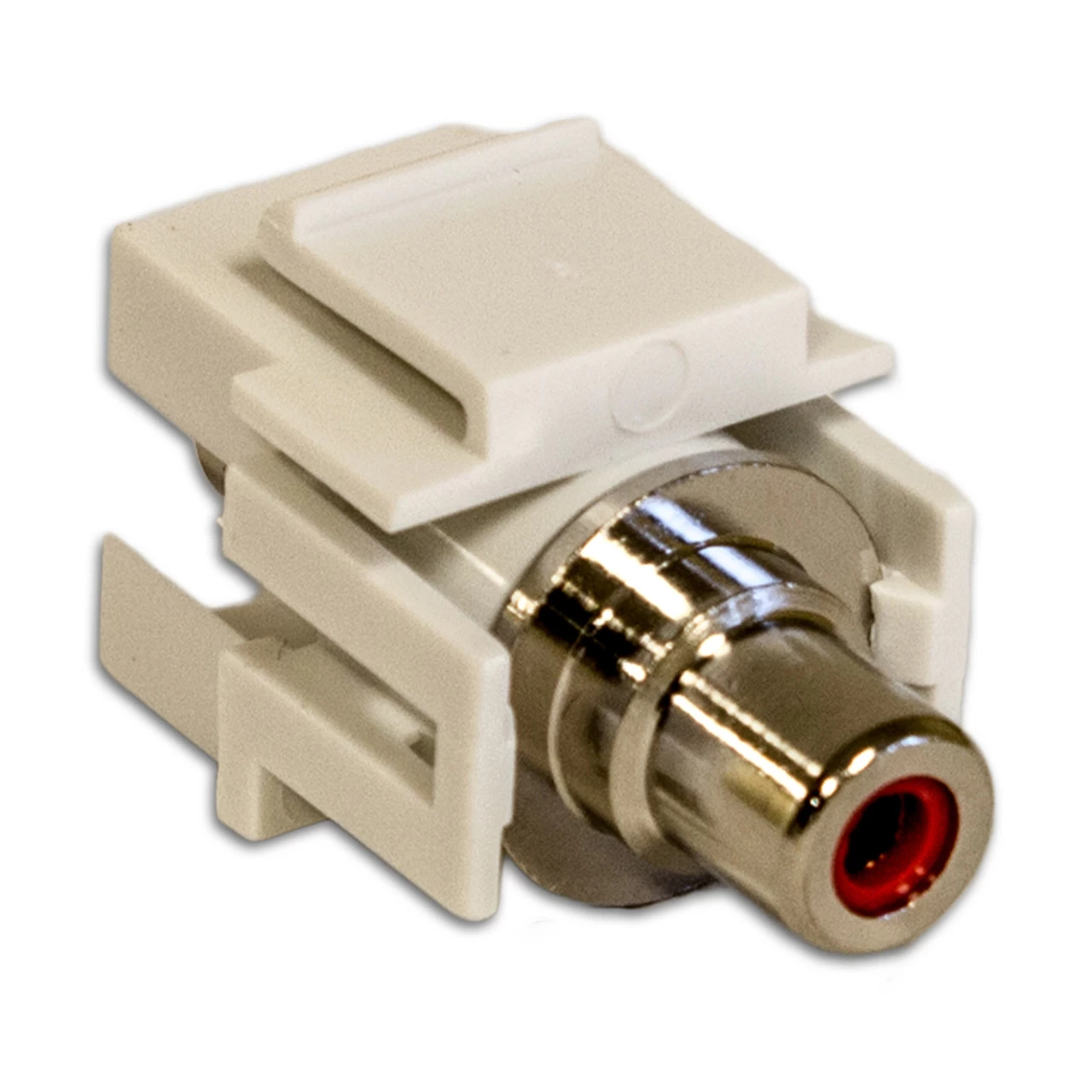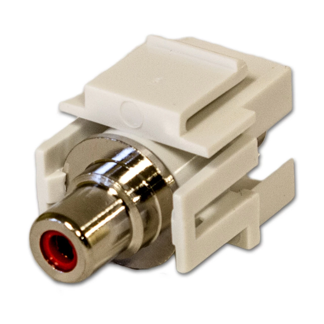 RCA Keystone Jack- Coupler type (female connections on both sides). White with Red Insulator. Intended for use in standard keystone wallplates and other keystone devices.